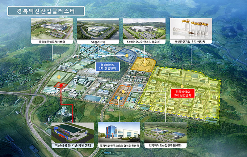 - 경북 안동 소재 백신산업클러스터 내 SK바이오사이언스, SK플라즈마, 동물세포실증지원센터, 백신상용화기술지원센터, 국제백신연구소 안동 분원 등 바이오/백신 제약 분야 우수 산업체 및 연구소 유치.