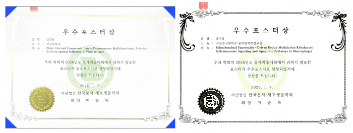 국립경국대학교(총장 정태주) 일반대학원 백신공학과 김주원 학생(석·박사 통합과정, 지도교수 장요한)과 홍우성 학생(석사과정, 지도교수 전세진)이 2026년도 한국분자·세포생물학회가 주최한 제 37회 동계학술대회에서 각각 우수포스터상을 수상하였다.